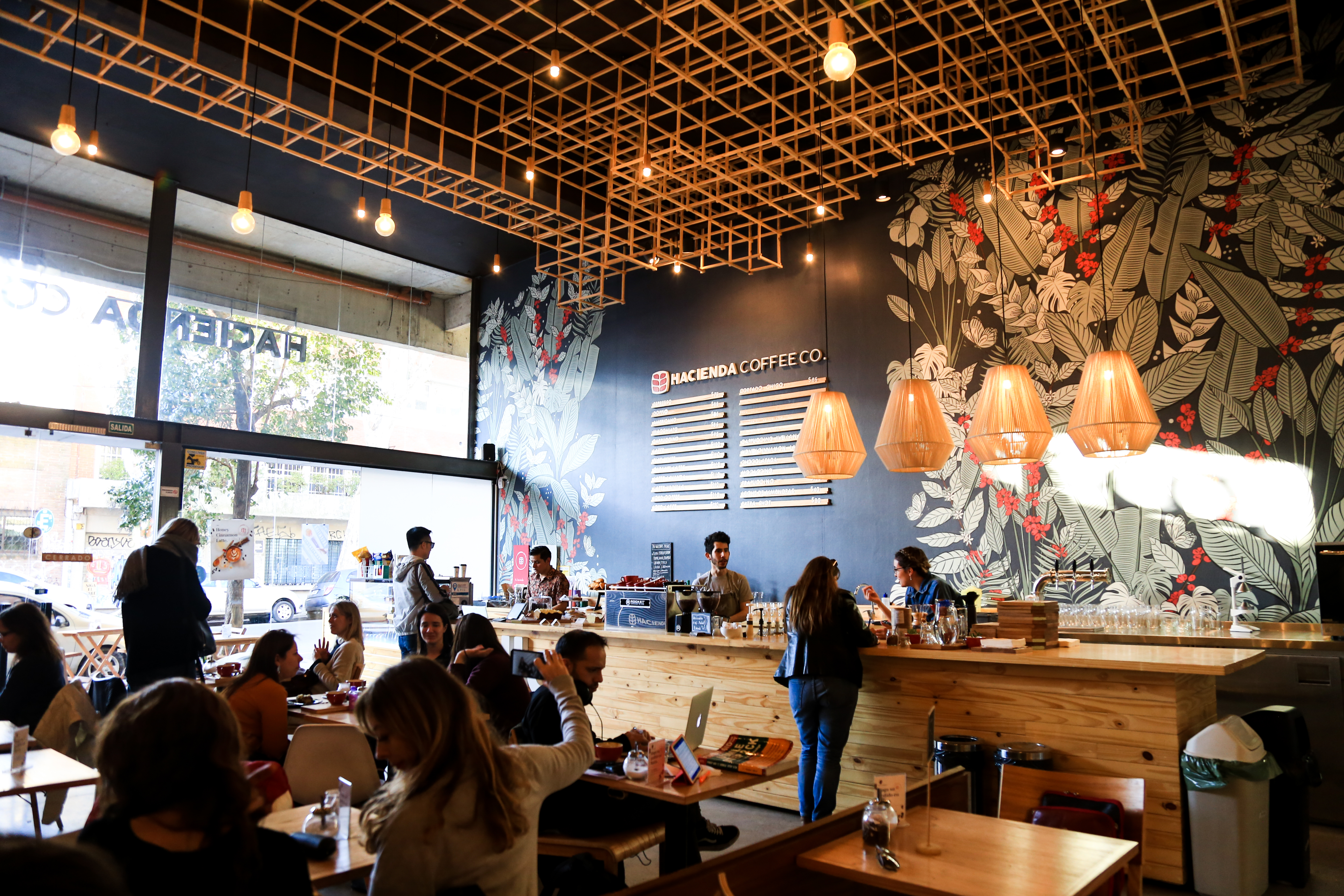 Hacienda Coffee es una cafetería femenina en estética y hospitalidad. Tiene tremenda barra, mucha madera, iluminación cálida, una cafetera Rocket que muestra todo su encanto, arte en las paredes (un mural cafetero y un gran espacio para exhibiciones) y el área de tostado está a la vista. Todo es muy prolijo y los baristas están deseosos de compartir experiencias, recomendar cafés, aportar detalles de tuestes y sabores. Hacienda invita a quedarse y trabajar, a quedarse y estudiar, a quedarse para que el tiempo pase, para tomar buen café y degustar productos venezolanos que, con orgullo, han incorporado.