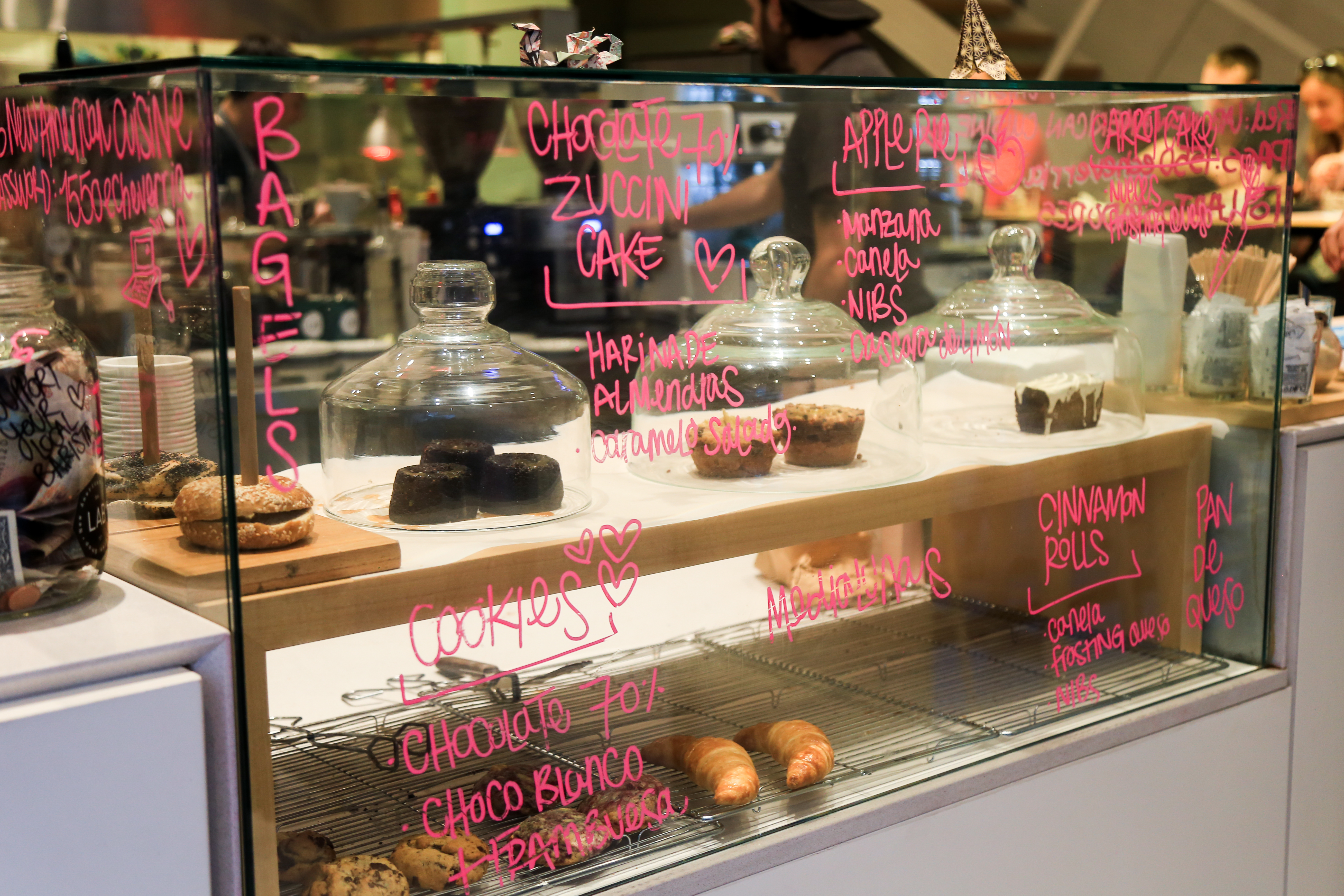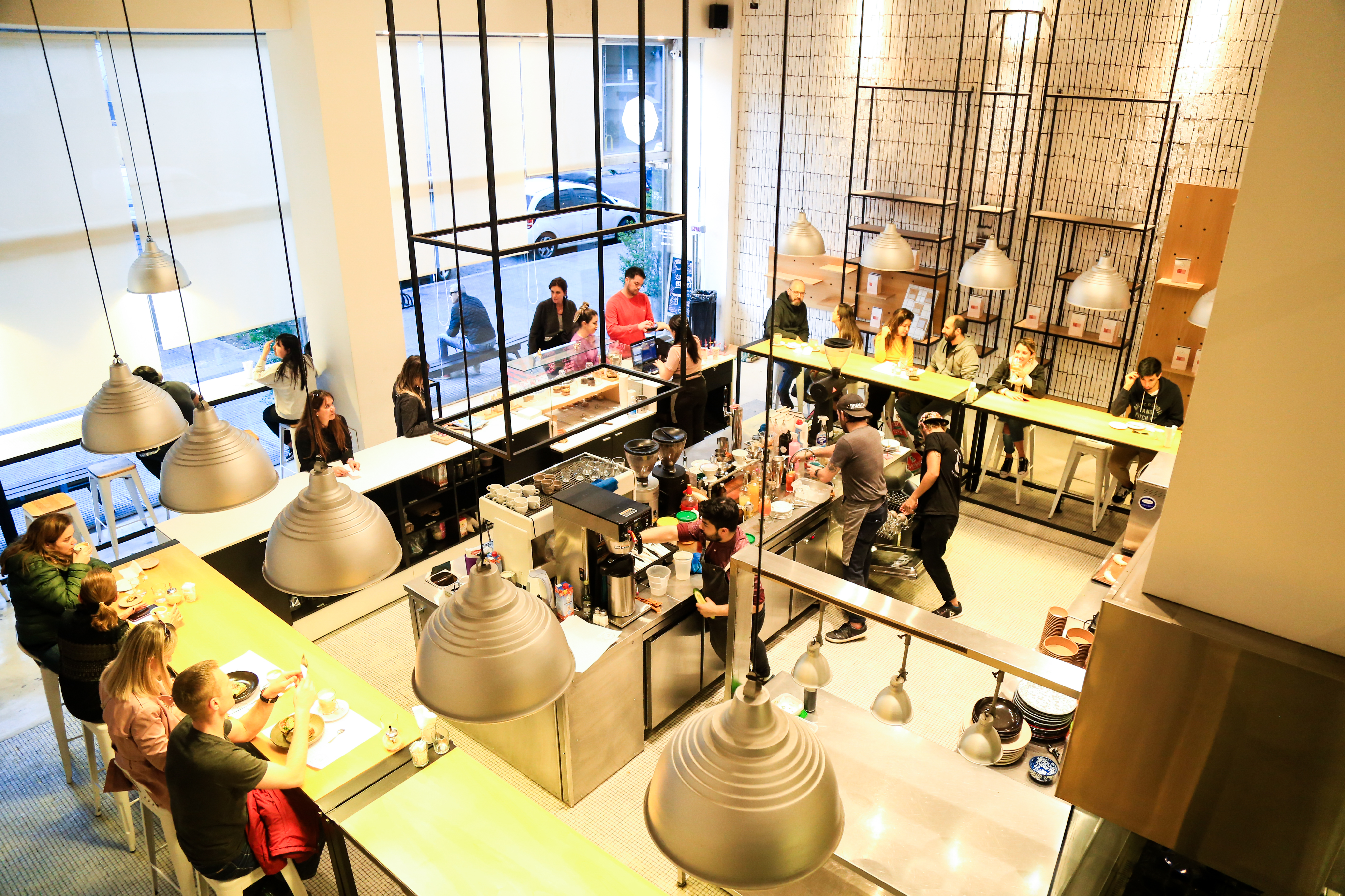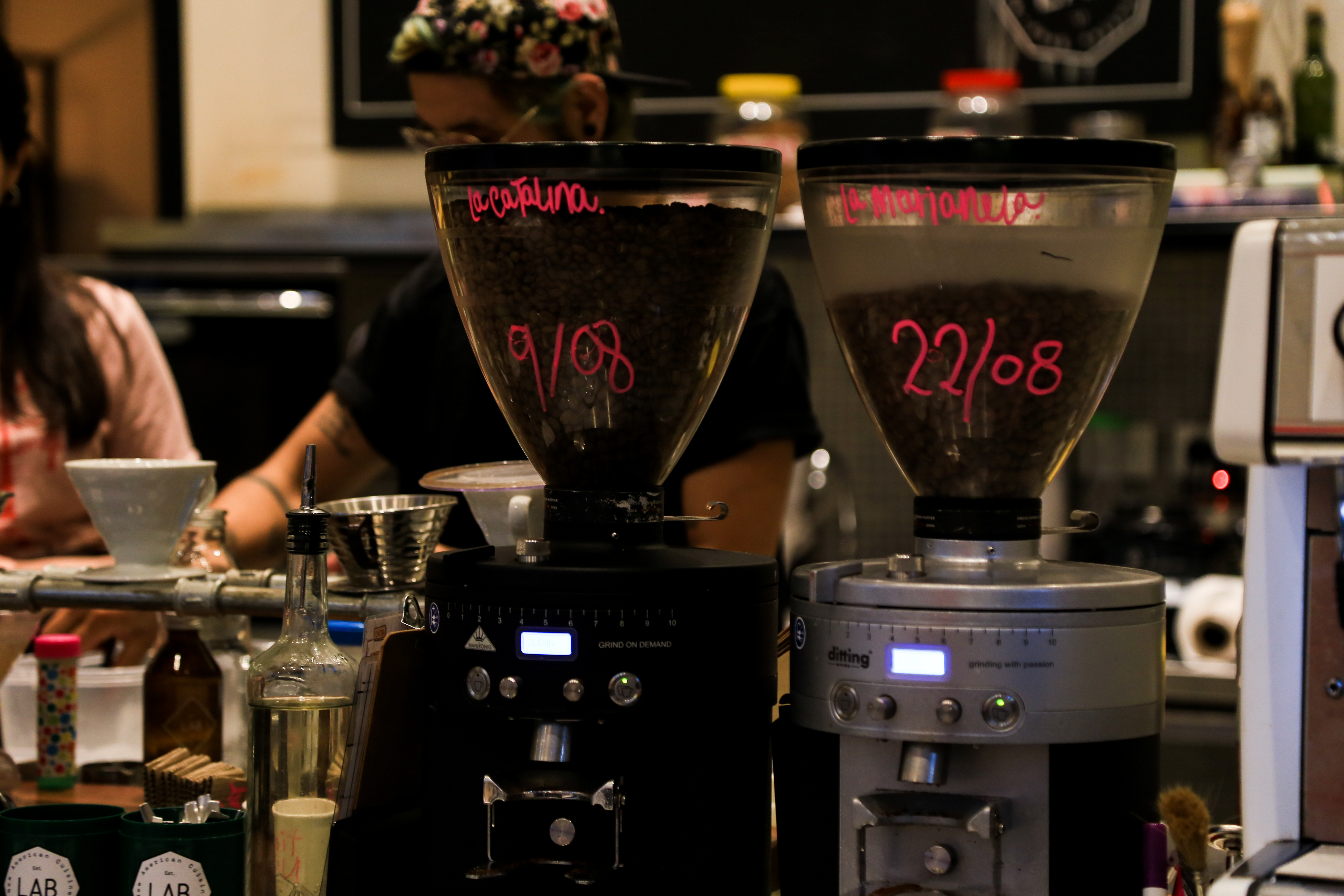 El área de elaboración de bebidas de LAB Tostadores de Café de Belgrano es el corazón, como si se tratara de un restaurante con cocina a la vista. Así, en el medio del salón principal los baristas cortejan una imponente cafetera Dalla Corte. La barra, generosa en tamaño, rodea el corazón y ofrece diferentes vistas que permiten percibir el ritmo de los cafés. La estética es de laboratorio fabril con detalles de la narrativa cafetera y toques en rosado brillante. Los granos de dos grandes tolvas se mueven constantemente. Los datos del origen y del tueste están a la vista todo el tiempo porque, en ese laboratorio, son indiscutidamente los protagonistas. La carta de bocados que acompaña las bebidas tiene sabores y texturas de jugada combinación. En LAB todo es innovación.